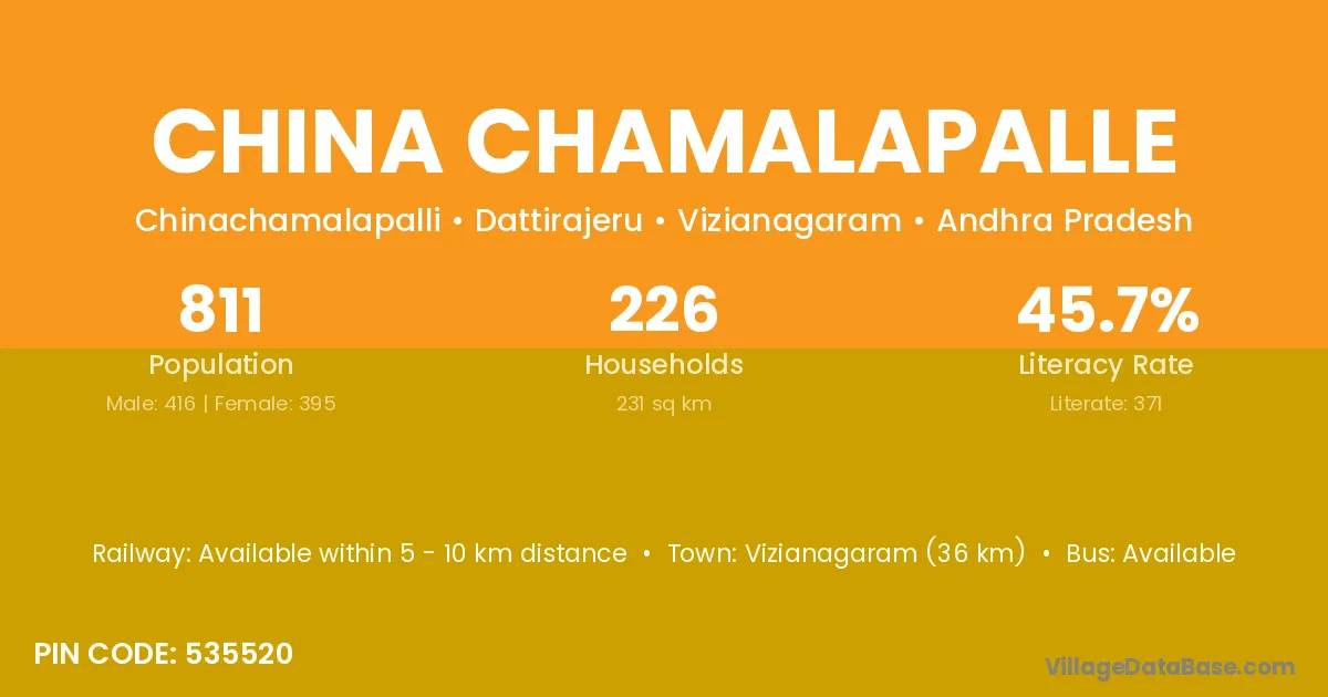 Vizianagaram (36 km) is the nearest town to China Chamalapalle village for major economic activities and is located approximately 36 km away.