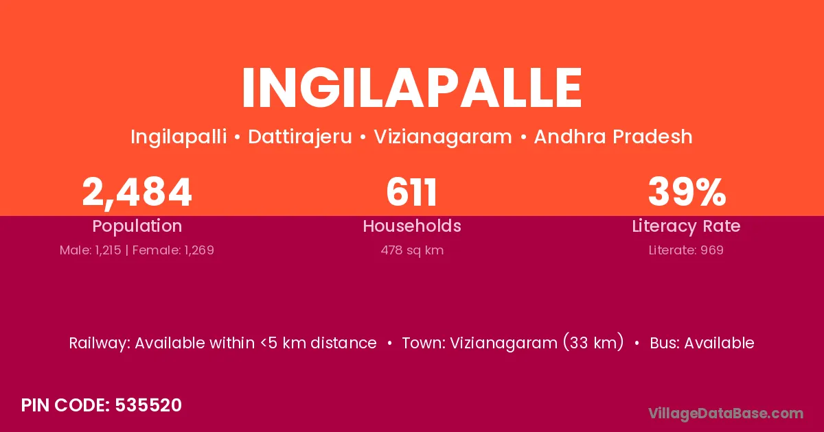 Vizianagaram (33 km) is the nearest town to Ingilapalle village for major economic activities and is located approximately 33 km away.