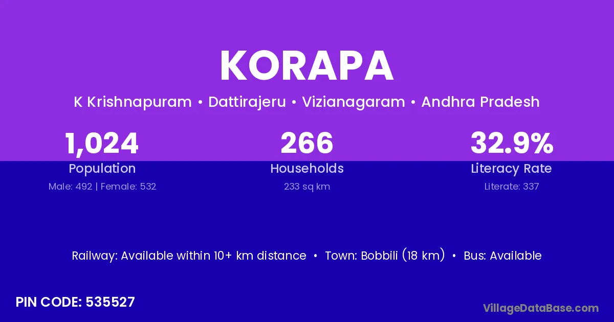 Bobbili (18 km) is the nearest town to Korapa village for major economic activities and is located approximately 18 km away.