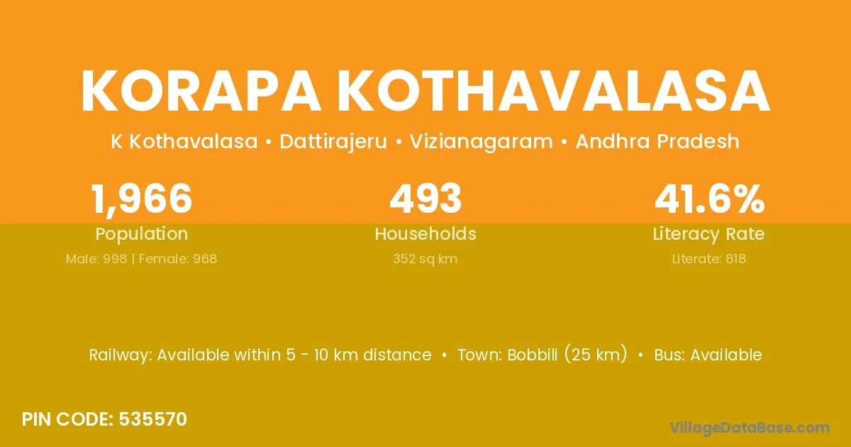 Korapa Kothavalasa village has a total population of 1,966 people, of which 998 are males and 968 are females.