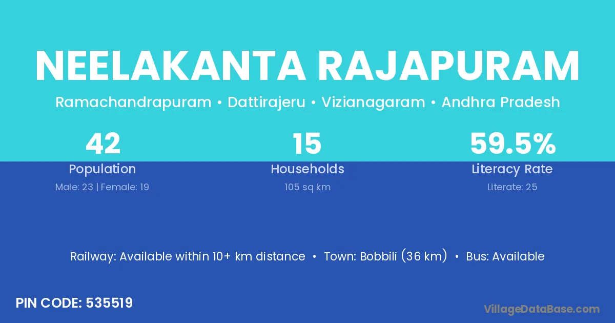 Bobbili (36 km) is the nearest town to Neelakanta Rajapuram village for major economic activities and is located approximately 36 km away.