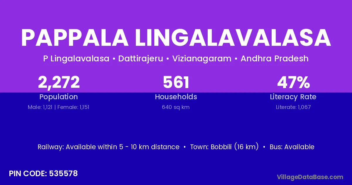 Pappala Lingalavalasa village has a total population of 2,272 people, of which 1,121 are males and 1,151 are females.