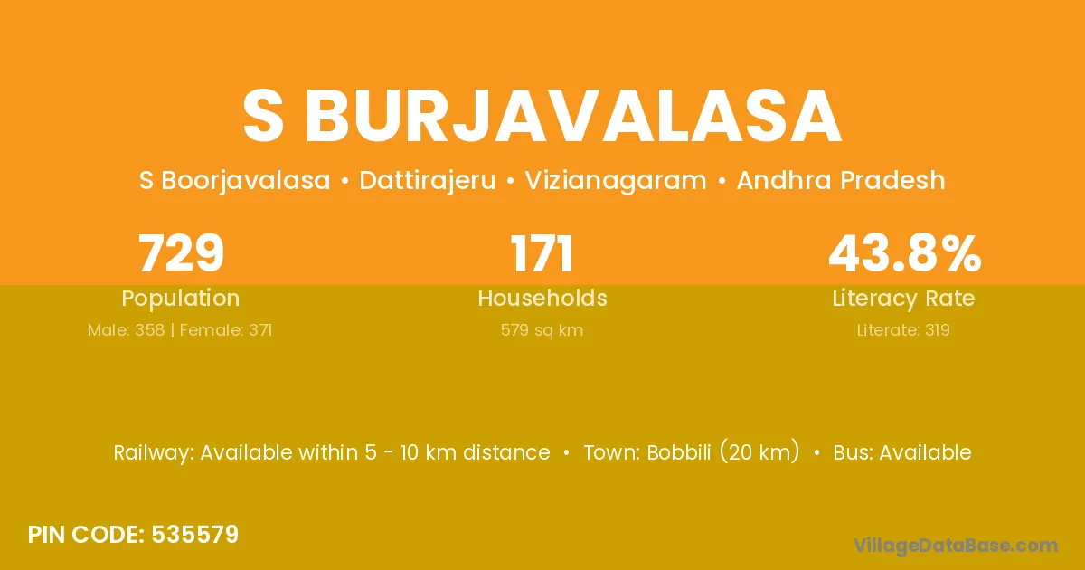 Bobbili (20 km) is the nearest town to S Burjavalasa village for major economic activities and is located approximately 20 km away.