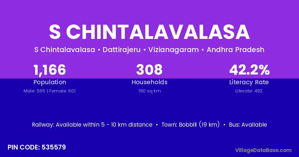 Bobbili (19 km) is the nearest town to S Chintalavalasa village for major economic activities and is located approximately 19 km away.