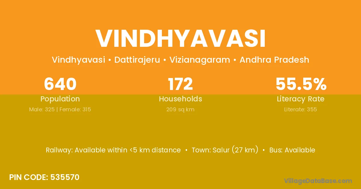 Salur (27 km) is the nearest town to Vindhyavasi village for major economic activities and is located approximately 27 km away.