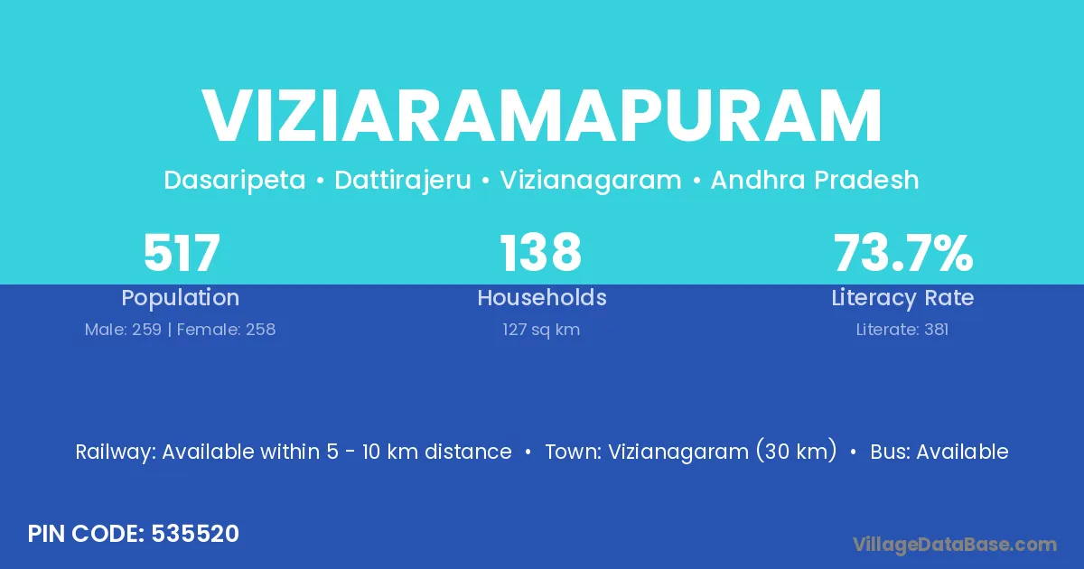 Viziaramapuram village has a total population of 517 people, of which 259 are males and 258 are females.