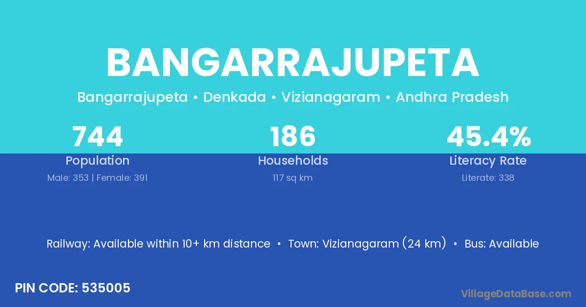 Vizianagaram (24 km) is the nearest town to Bangarrajupeta village for major economic activities and is located approximately 24 km away.