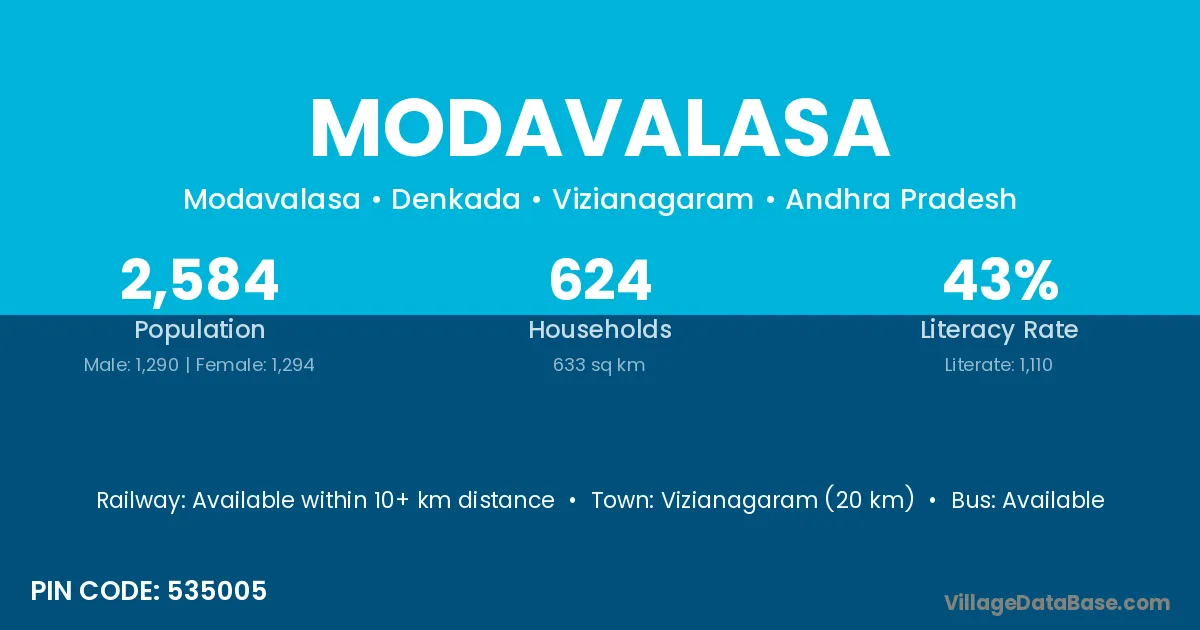 Vizianagaram (20 km) is the nearest town to Modavalasa village for major economic activities and is located approximately 20 km away.