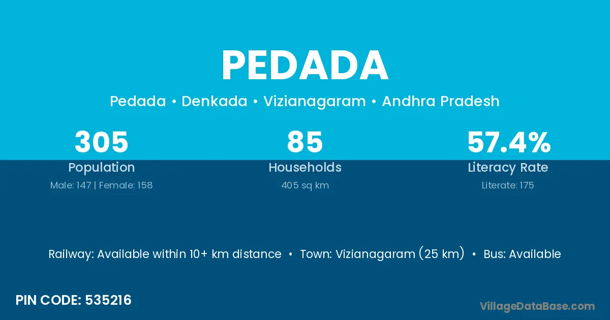Vizianagaram (25 km) is the nearest town to Pedada village for major economic activities and is located approximately 25 km away.