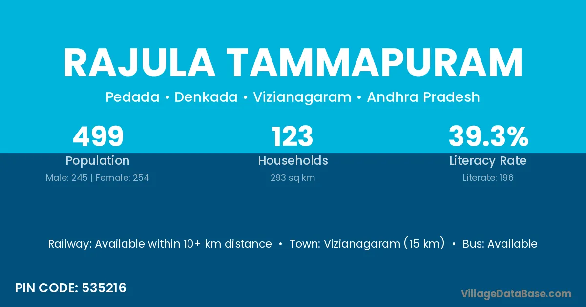 Vizianagaram (15 km) is the nearest town to Rajula Tammapuram village for major economic activities and is located approximately 15 km away.