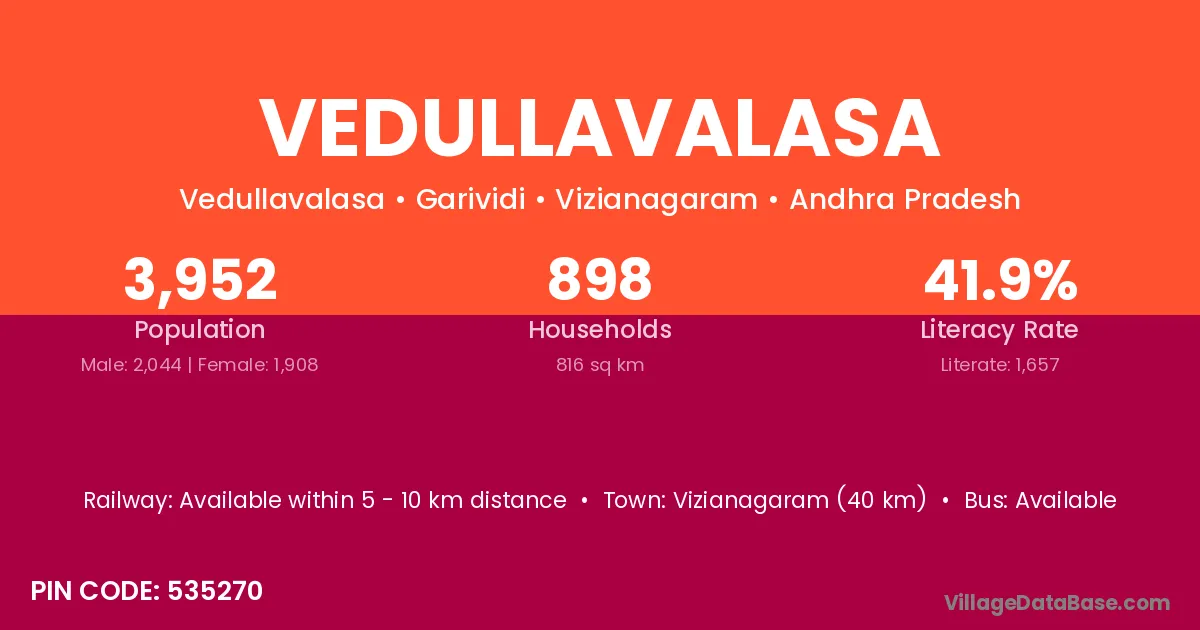 The literacy rate of Vedullavalasa village is 46.03%. Male literacy stands at 52.56% and female literacy at 39.50%.