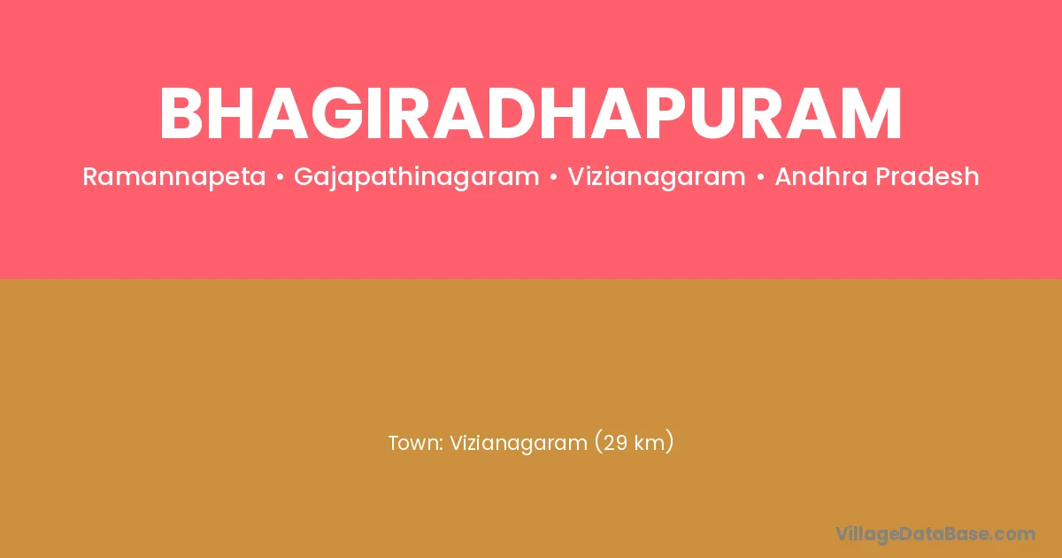 Vizianagaram (29 km) is the nearest town to Bhagiradhapuram village for major economic activities and is located approximately 29 km away.