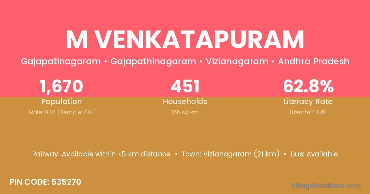 M Venkatapuram village has a total population of 1,670 people, of which 806 are males and 864 are females.