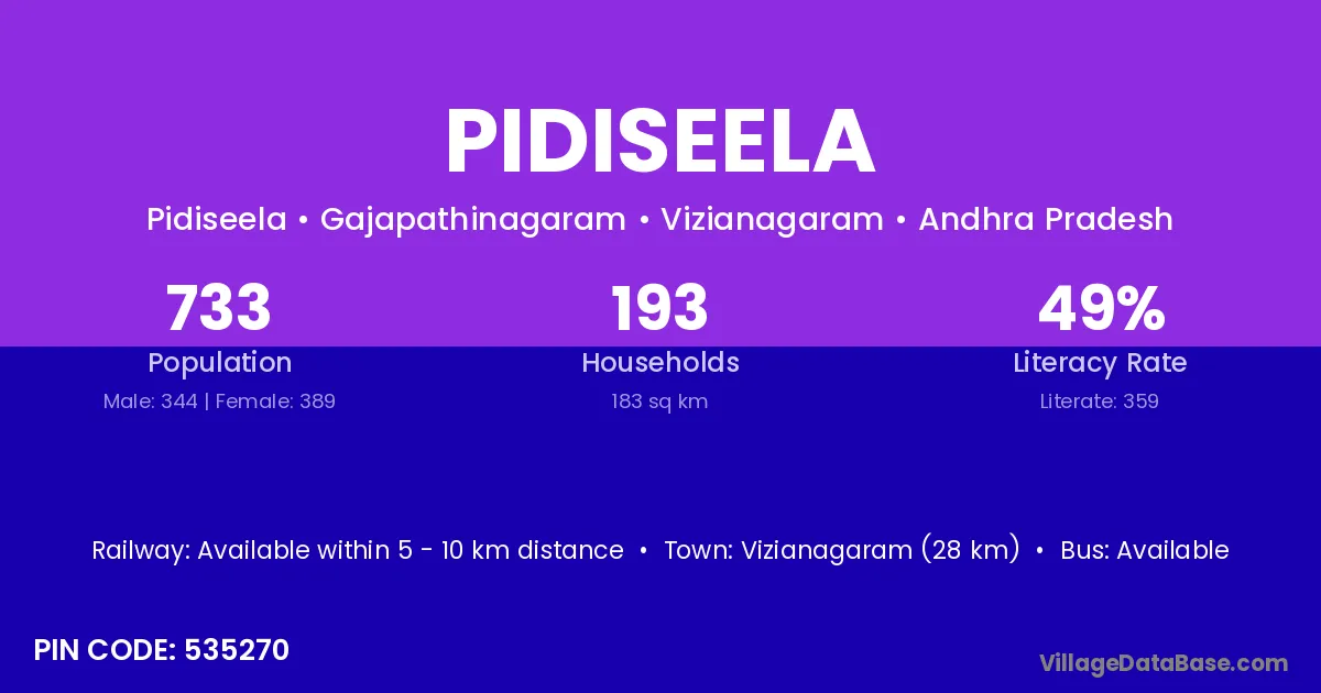 Vizianagaram (28 km) is the nearest town to Pidiseela village for major economic activities and is located approximately 28 km away.