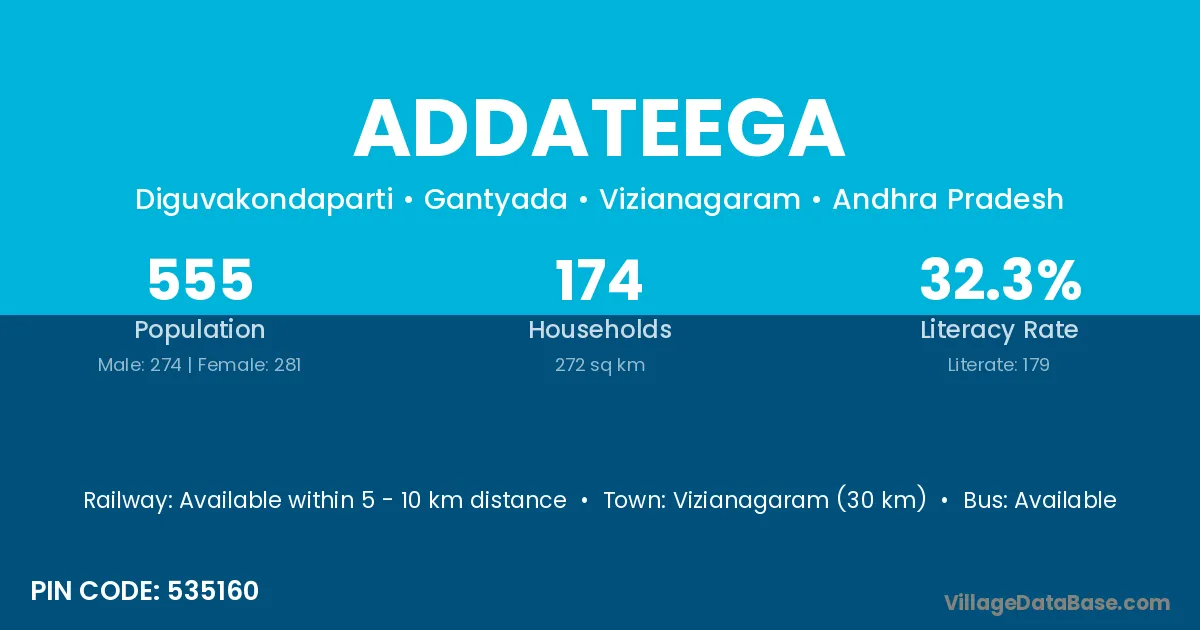 Vizianagaram (30 km) is the nearest town to Addateega village for major economic activities and is located approximately 30 km away.