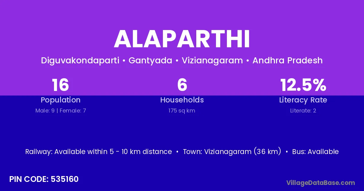 Vizianagaram (36 km) is the nearest town to Alaparthi village for major economic activities and is located approximately 36 km away.
