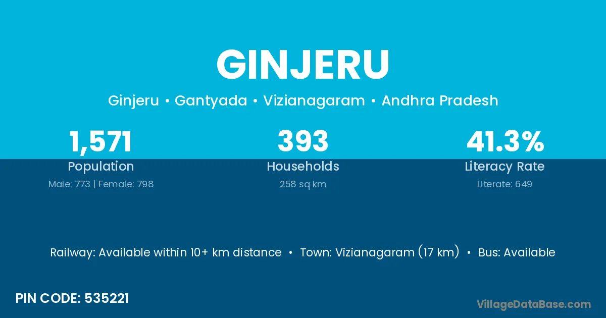 Vizianagaram (17 km) is the nearest town to Ginjeru village for major economic activities and is located approximately 17 km away.