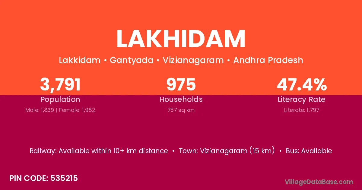 Vizianagaram (15 km) is the nearest town to Lakhidam village for major economic activities and is located approximately 15 km away.