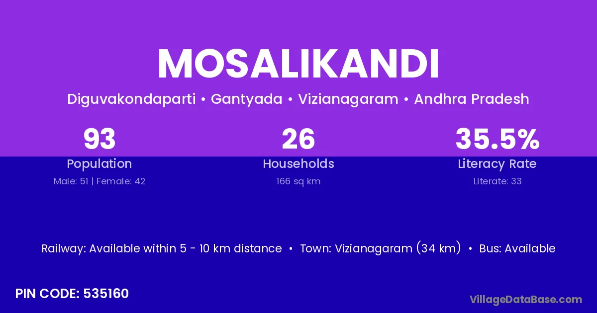 Vizianagaram (34 km) is the nearest town to Mosalikandi village for major economic activities and is located approximately 34 km away.