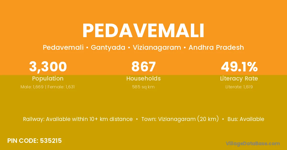 Vizianagaram (20 km) is the nearest town to Pedavemali village for major economic activities and is located approximately 20 km away.