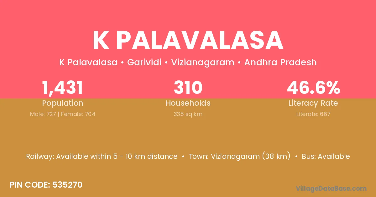 K Palavalasa village has a total population of 1,431 people, of which 727 are males and 704 are females.