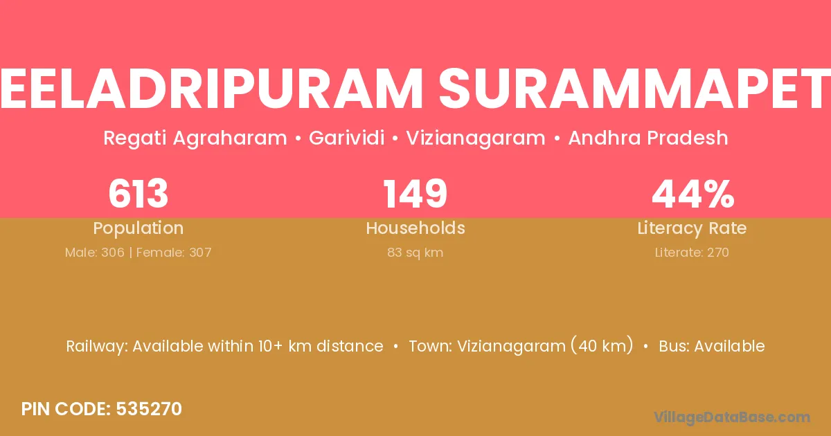 Neeladripuram Surammapeta village has a total population of 613 people, of which 306 are males and 307 are females.