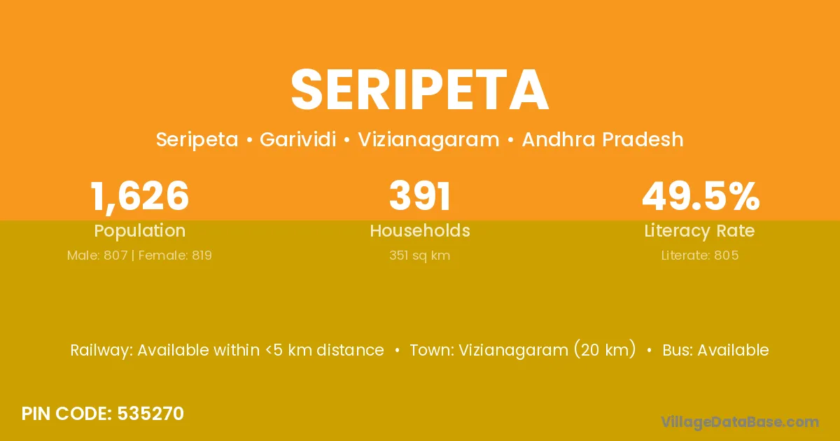 Vizianagaram (20 km) is the nearest town to Seripeta village for major economic activities and is located approximately 20 km away.
