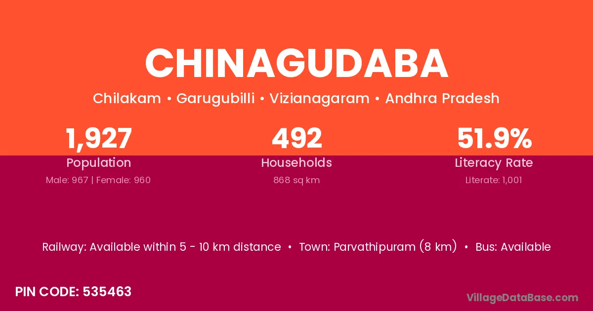 Parvathipuram (8 km) is the nearest town to Chinagudaba village for major economic activities and is located approximately 8 km away.