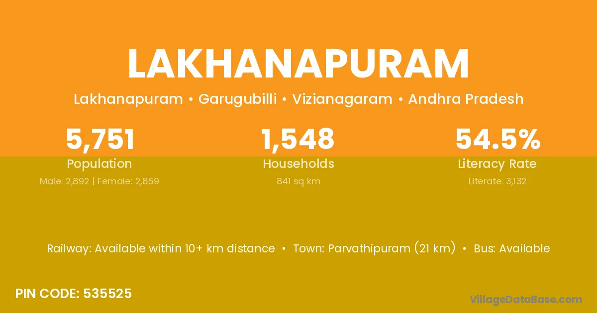 Parvathipuram (21 km) is the nearest town to Lakhanapuram village for major economic activities and is located approximately 21 km away.
