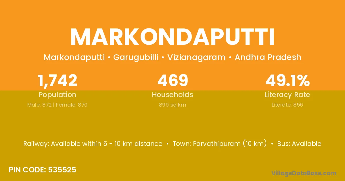 Parvathipuram (10 km) is the nearest town to Markondaputti village for major economic activities and is located approximately 10 km away.