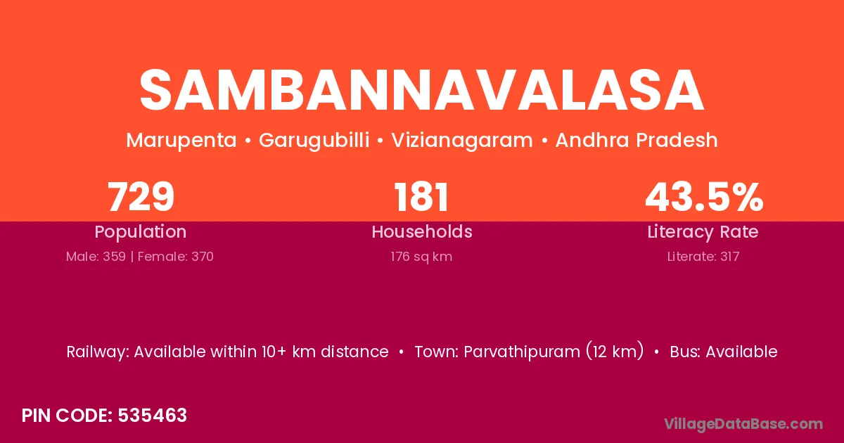 Sambannavalasa village has a total population of 729 people, of which 359 are males and 370 are females.