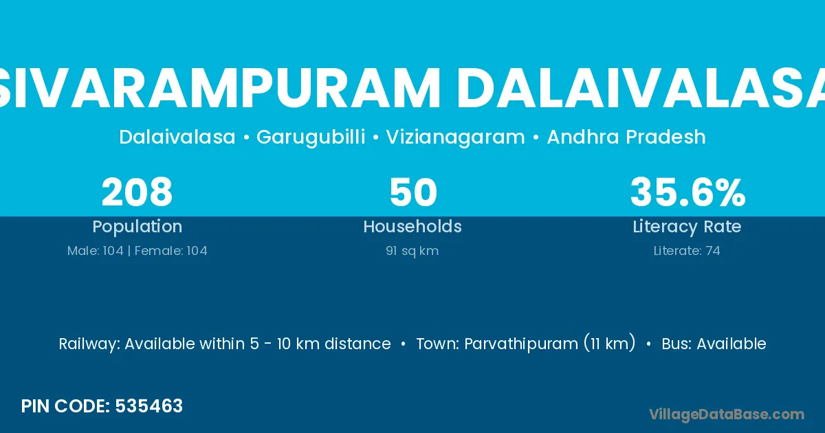 Parvathipuram (11 km) is the nearest town to Sivarampuram Dalaivalasa village for major economic activities and is located approximately 11 km away.
