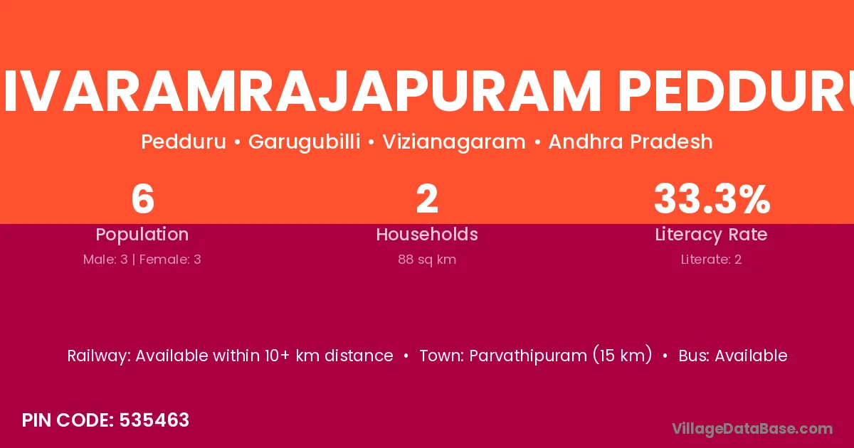 Parvathipuram (15 km) is the nearest town to Sivaramrajapuram Pedduru village for major economic activities and is located approximately 15 km away.