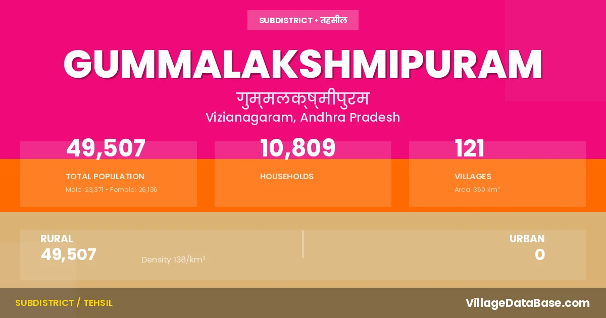 According to the 2011 census The total area of Gummalakshmipuram Mandal is 360 km², with a population of 49507 people. The population density is 138 inhabitants per square kilometre, and there are approximately 10809 houses in the sub district.