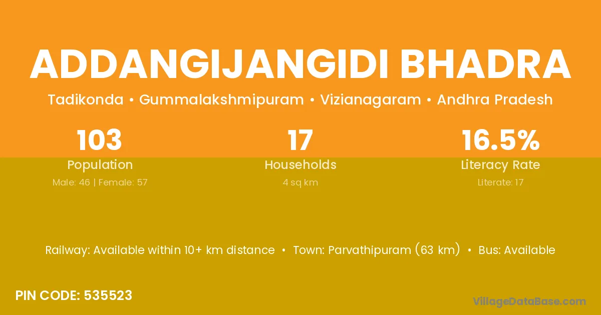 Parvathipuram (63 km) is the nearest town to Addangijangidi Bhadra village for major economic activities and is located approximately 63 km away.