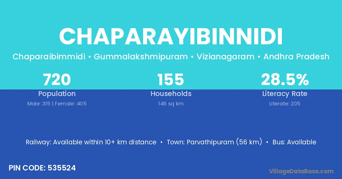 Parvathipuram (56 km) is the nearest town to Chaparayibinnidi village for major economic activities and is located approximately 56 km away.