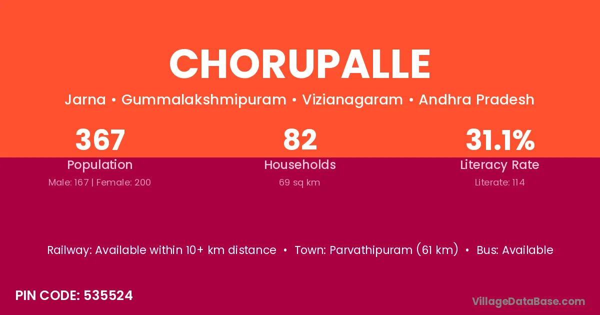 Parvathipuram (61 km) is the nearest town to Chorupalle village for major economic activities and is located approximately 61 km away.