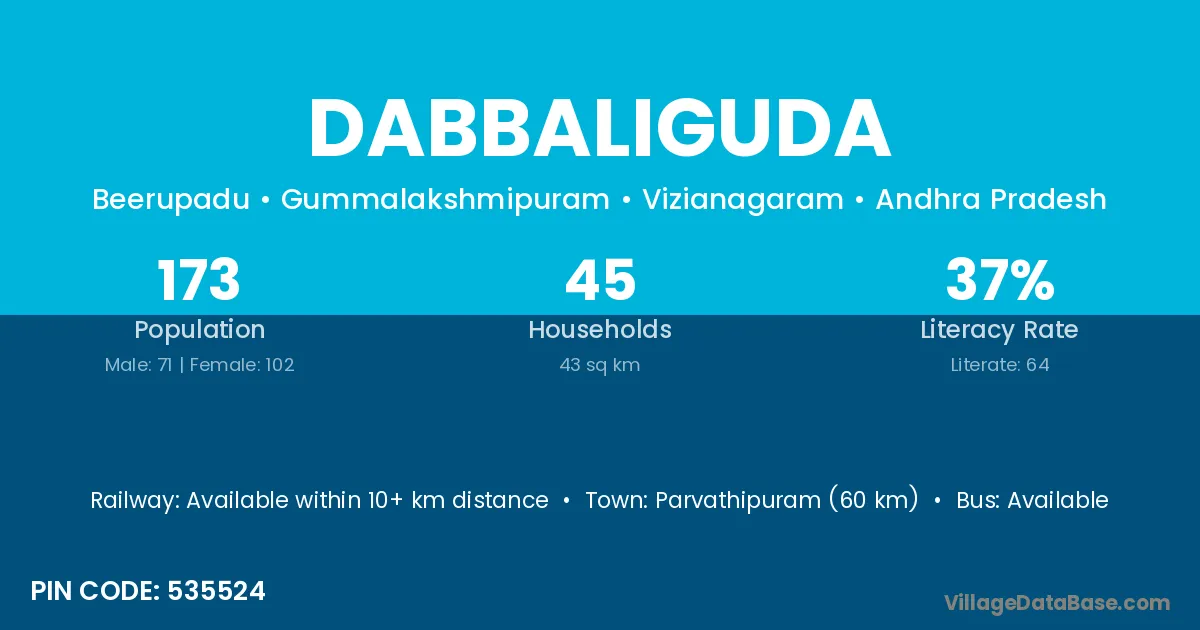 Parvathipuram (60 km) is the nearest town to Dabbaliguda village for major economic activities and is located approximately 60 km away.