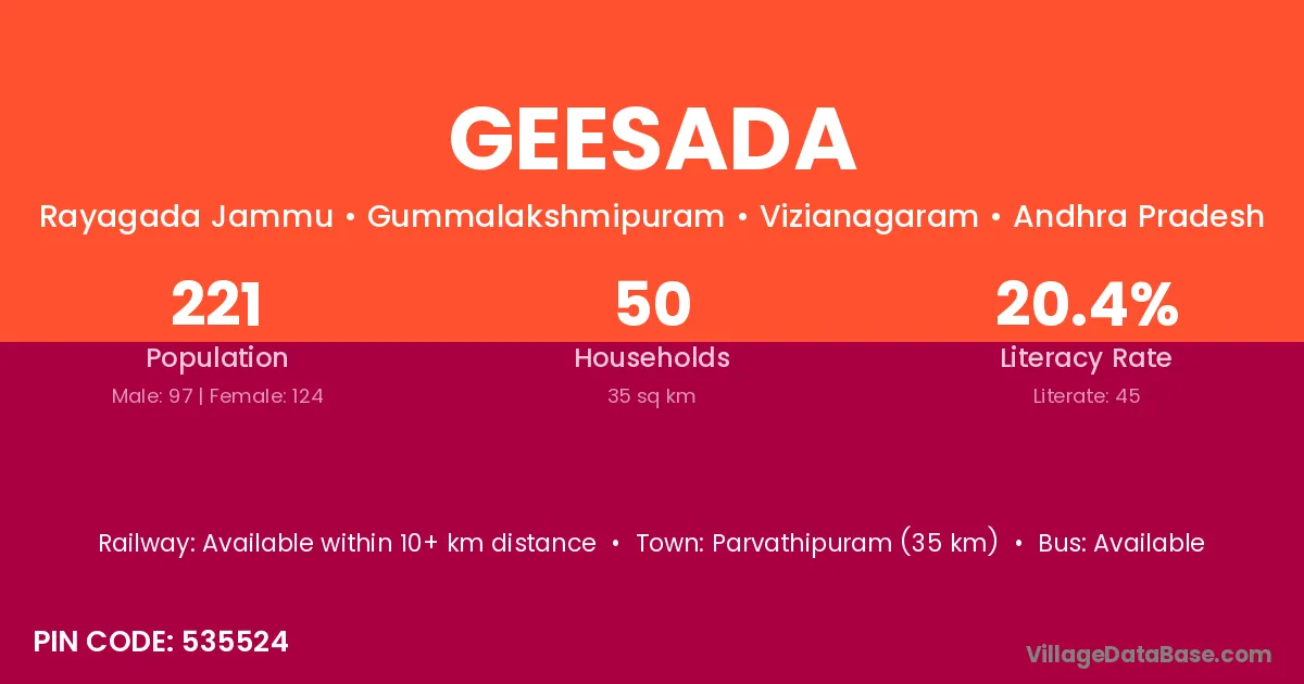 Parvathipuram (35 km) is the nearest town to Geesada village for major economic activities and is located approximately 35 km away.