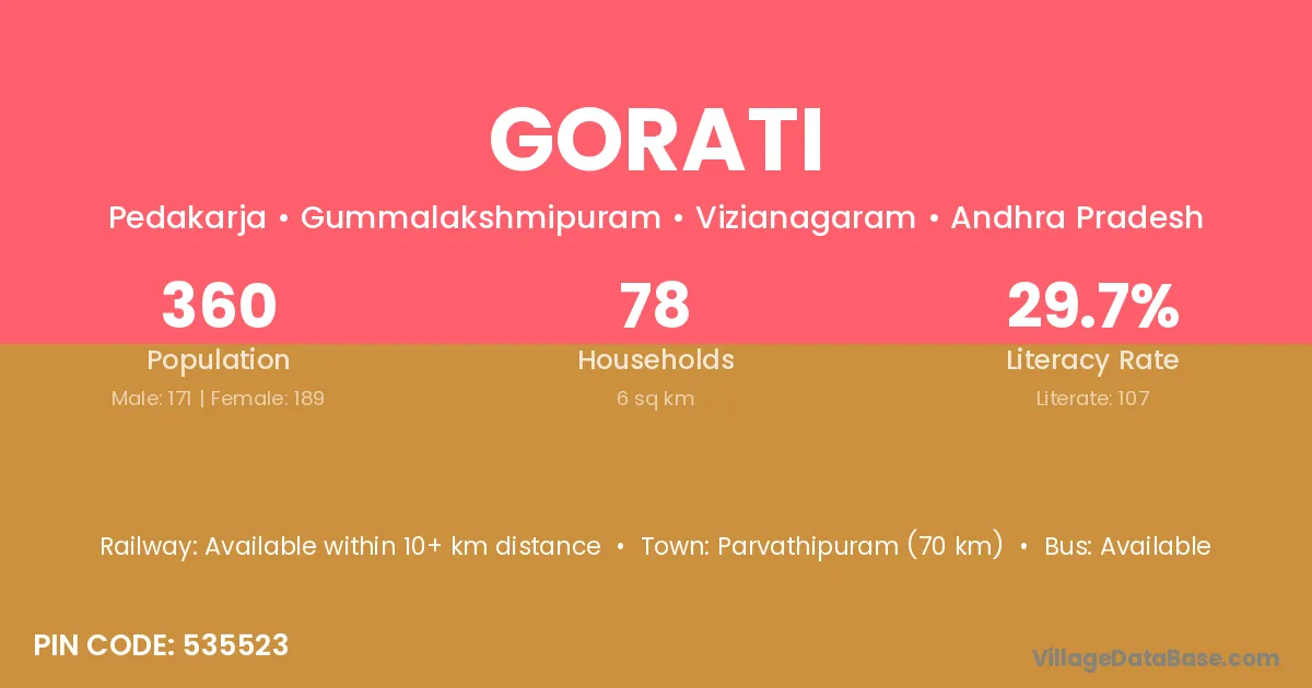 Parvathipuram (70 km) is the nearest town to Gorati village for major economic activities and is located approximately 70 km away.