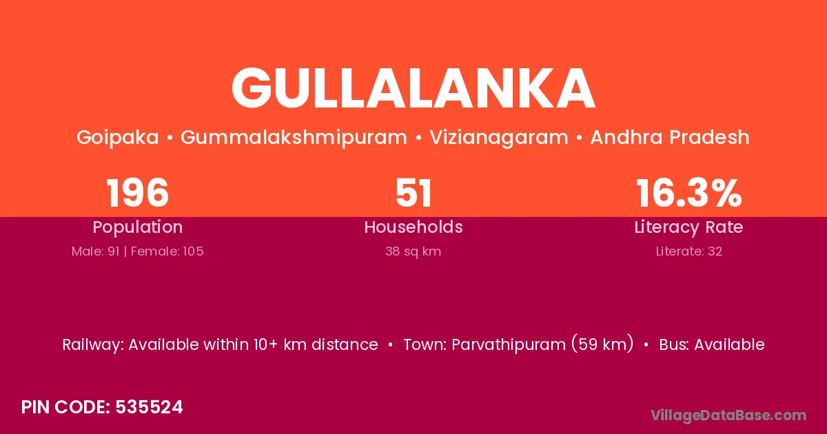 Parvathipuram (59 km) is the nearest town to Gullalanka village for major economic activities and is located approximately 59 km away.
