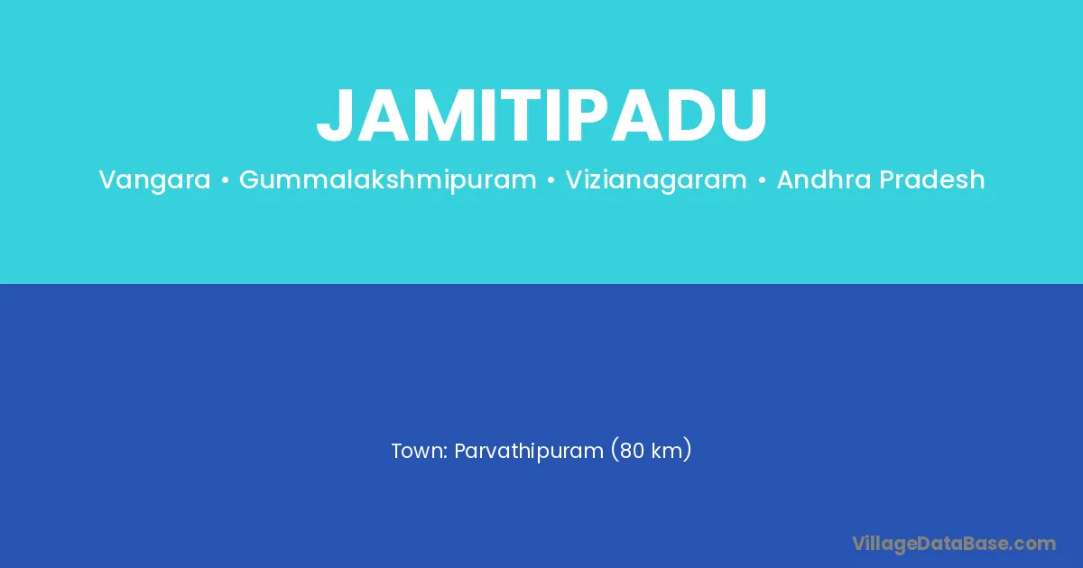 Parvathipuram (80 km) is the nearest town to Jamitipadu village for major economic activities and is located approximately 80 km away.