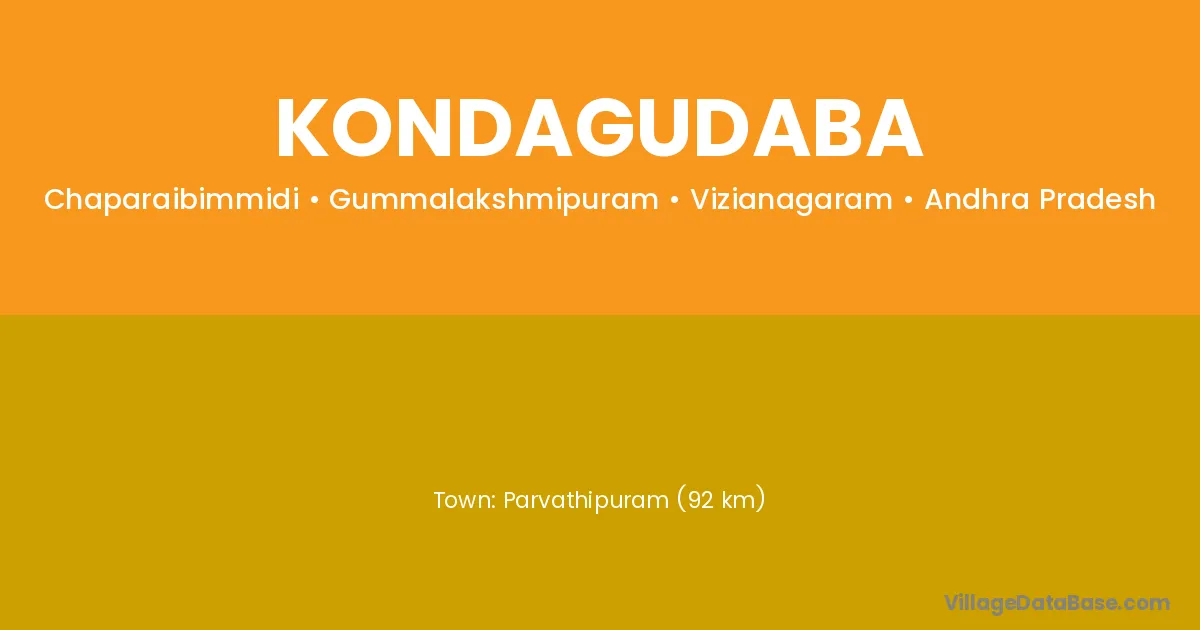 Parvathipuram (92 km) is the nearest town to Kondagudaba village for major economic activities and is located approximately 92 km away.