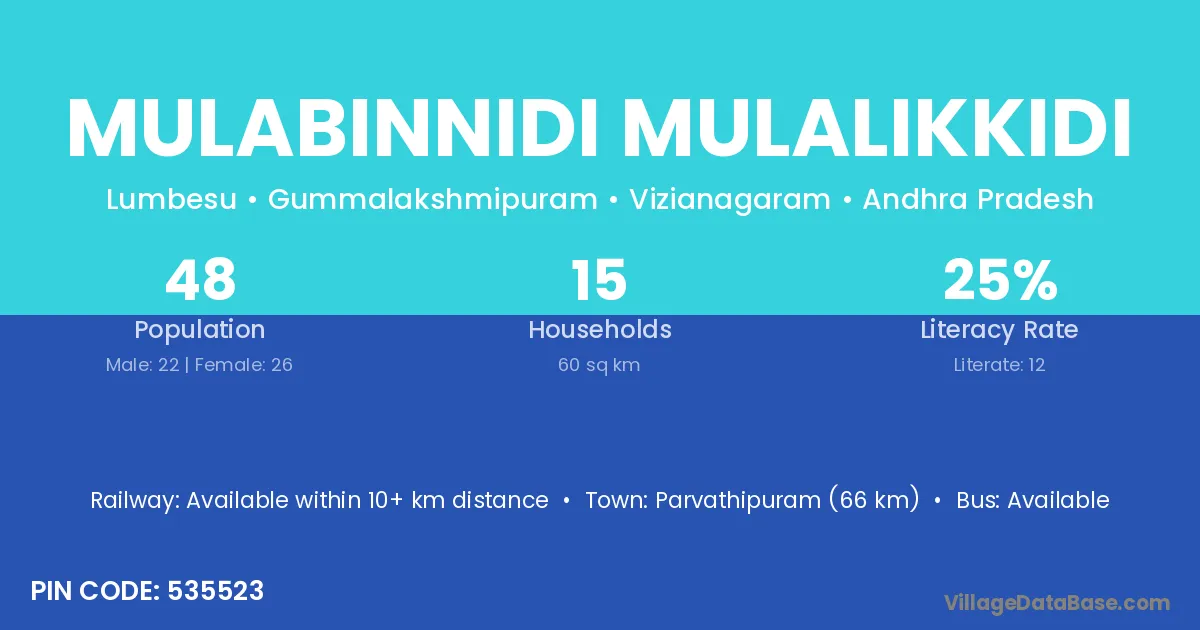 Mulabinnidi Mulalikkidi village has a total population of 48 people, of which 22 are males and 26 are females.