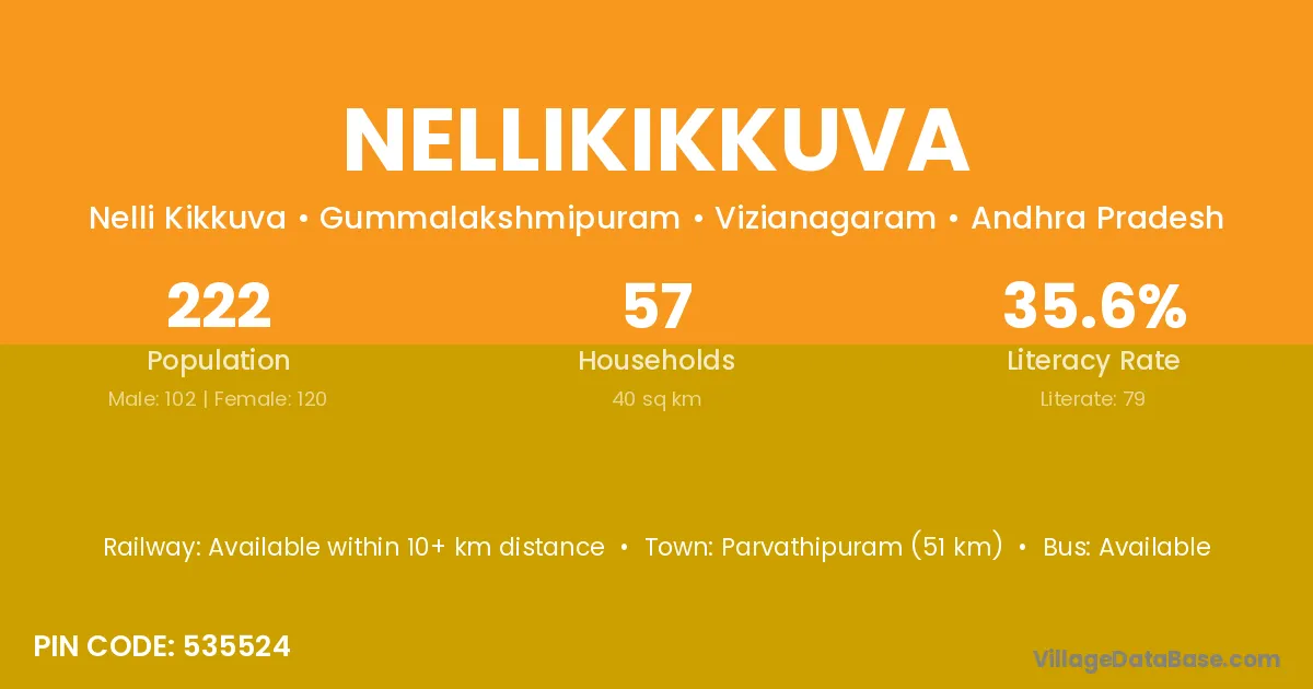 Parvathipuram (51 km) is the nearest town to Nellikikkuva village for major economic activities and is located approximately 51 km away.