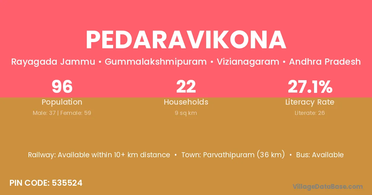 Pedaravikona village has a total population of 96 people, of which 37 are males and 59 are females.