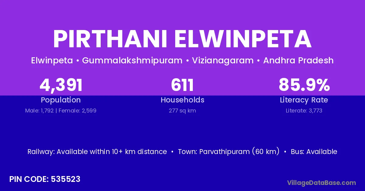 Parvathipuram (60 km) is the nearest town to Pirthani Elwinpeta village for major economic activities and is located approximately 60 km away.