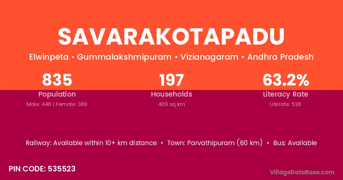 Parvathipuram (60 km) is the nearest town to Savarakotapadu village for major economic activities and is located approximately 60 km away.