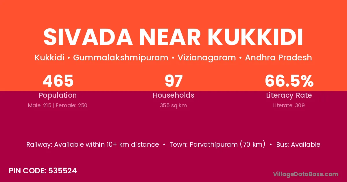 Sivada Near Kukkidi village has a total population of 465 people, of which 215 are males and 250 are females.