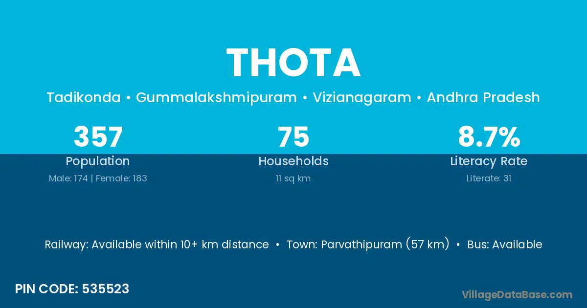 Parvathipuram (57 km) is the nearest town to Thota village for major economic activities and is located approximately 57 km away.